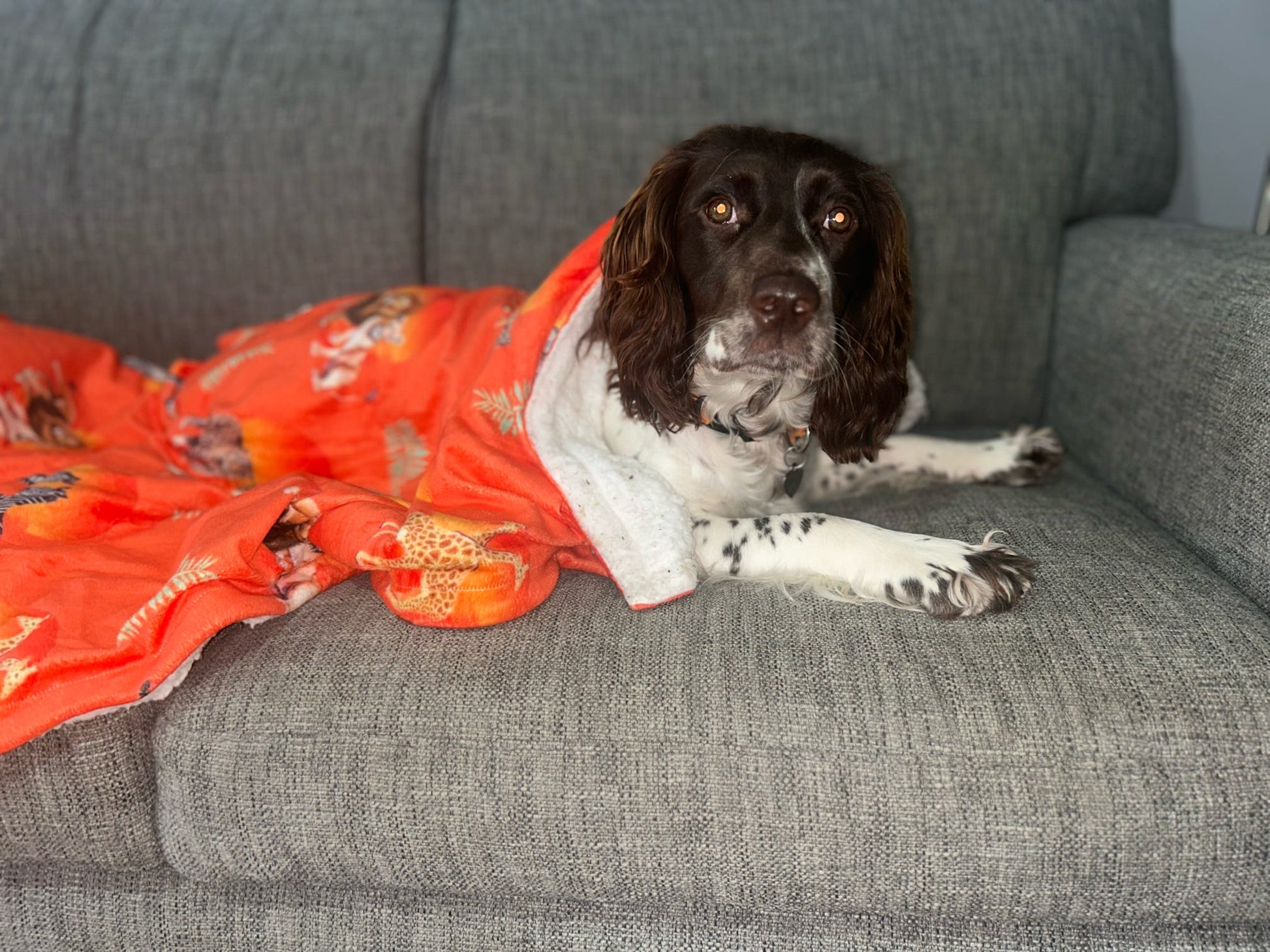 our snuggle blankets are large size 150cm by 100cm with a soft velvety comfortable top and a cozy warm Sherpa underneath pawfect for large dogs and multiple pet homes
